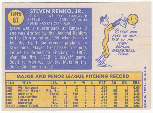 1970 TOPPS #87 STEVE RENKO BASEBALL ROOKIE CARD FOR SALE: Click on the image text to return to where you were on the Vintage Baseball Cards Page.